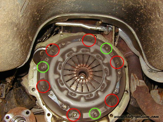 Dévisser les six boulons qui servent à maintenir l'embrayage en place sur le volant moteur. (clé de 12)