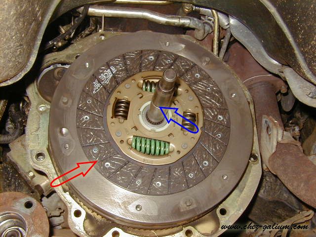 Pose du disque d'embrayage qui est maintenus en place et bien centrer grâce au centreur. La partie centrale du disque la plus saillante ce met vers l'extérieur
